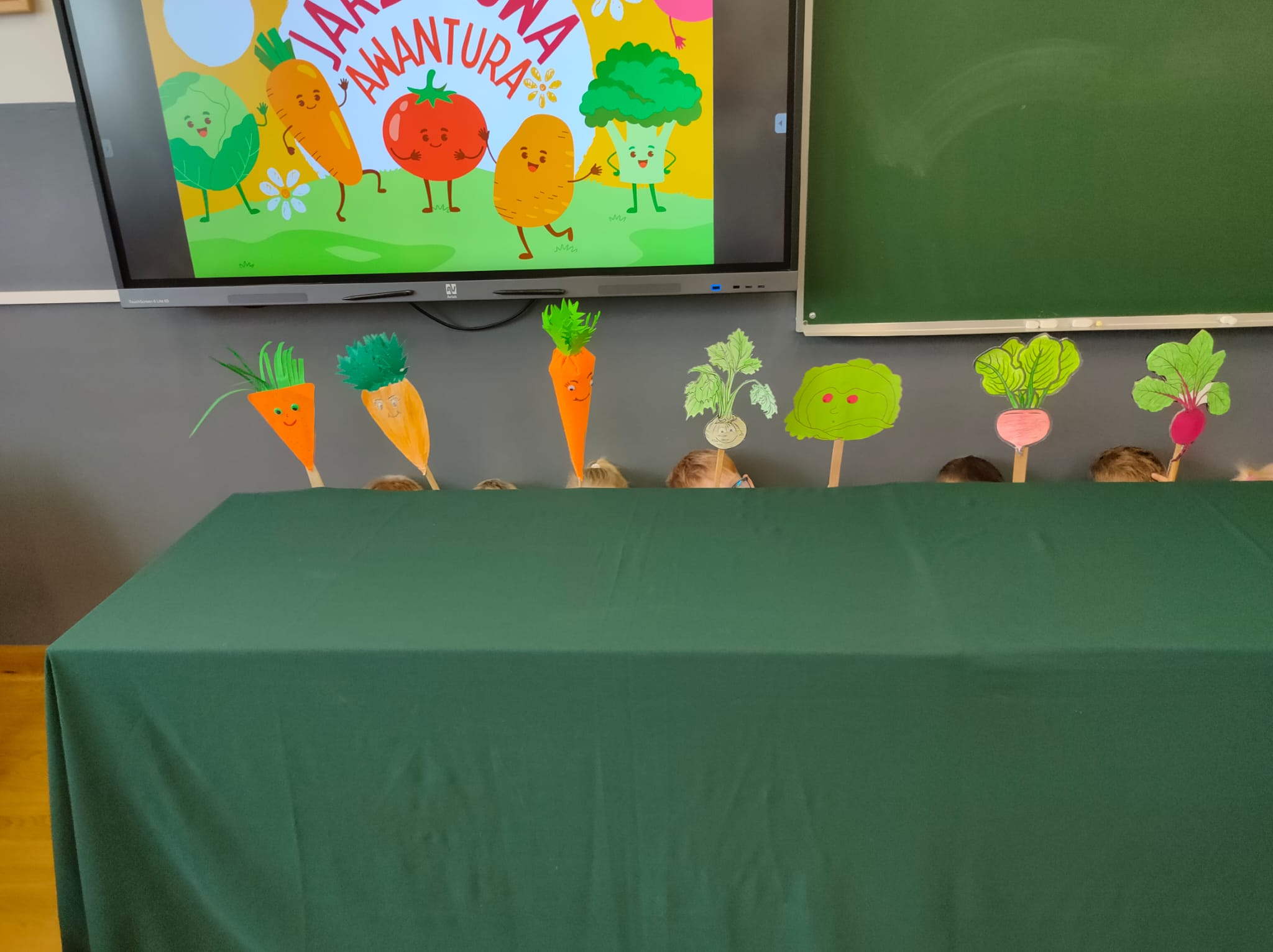 Uczniowie klasy 2B przygotowali i zaprezentowali inscenizację pt. „Jarzynowa awantura” dla dzieci z przedszkola. Przedstawienie miało na celu zachęcenie najmłodszych do zdrowego odżywiania oraz pokazanie, że warzywa i owoce mogą być nie tylko smaczne, ale też bardzo potrzebne dla zdrowia.