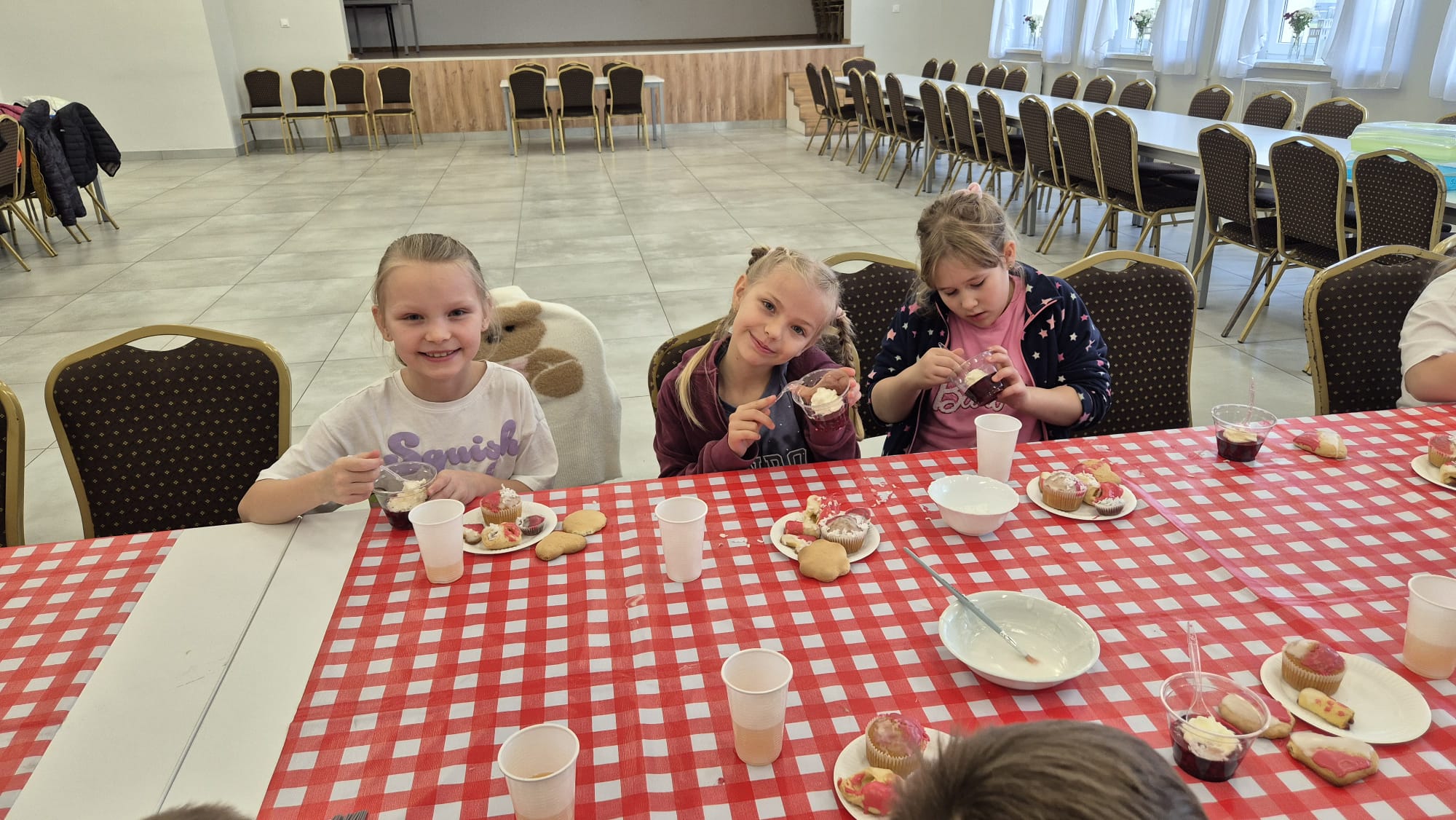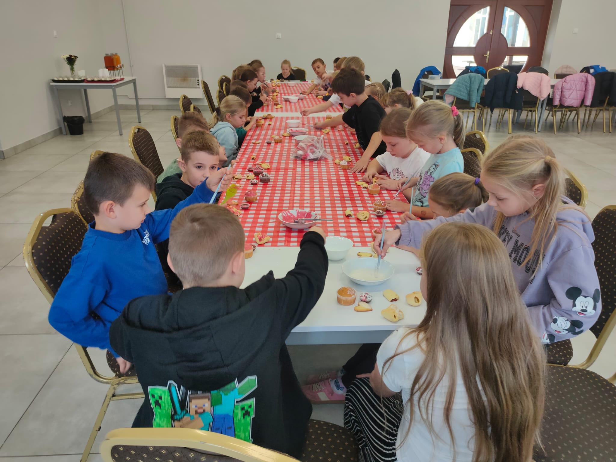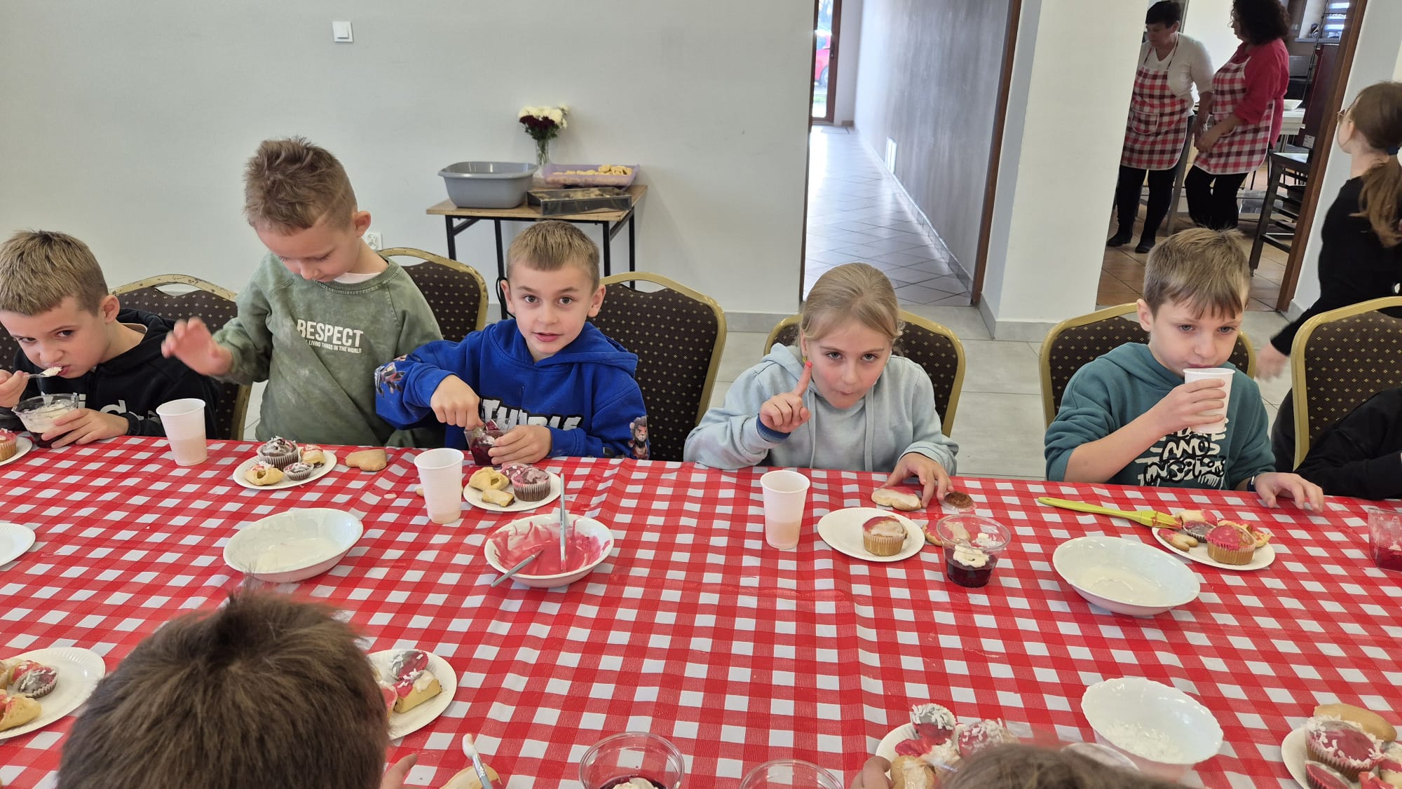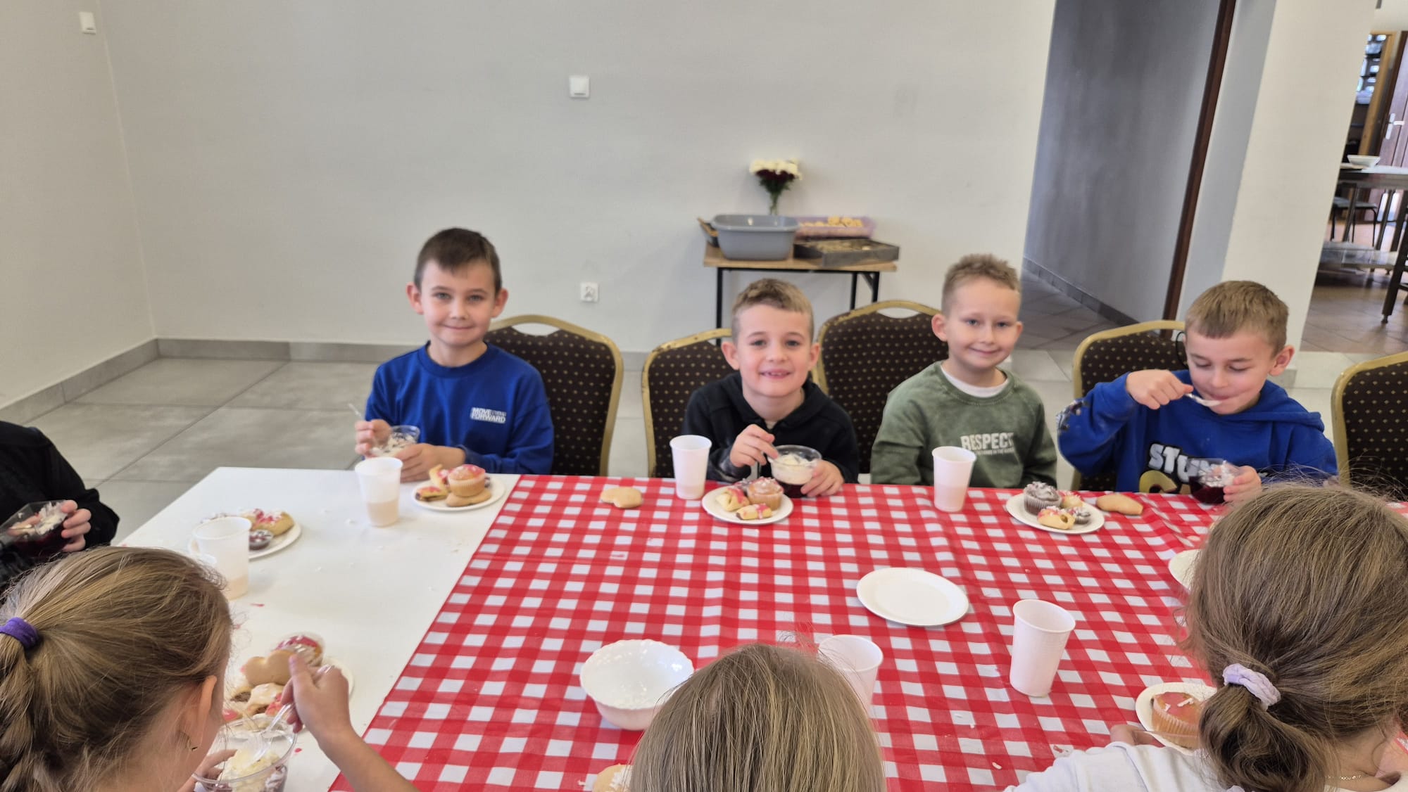 Po zakończeniu pracy na wszystkich czekała miła niespodzianka – panie z Koła Gospodyń Wiejskich poczęstowały dzieci smacznym deserem, babeczkami i sokiem. Spotkanie przebiegło w miłej i radosnej atmosferze, a uczniowie z dumą zabrali do domu własnoręcznie upieczone ciasteczka.