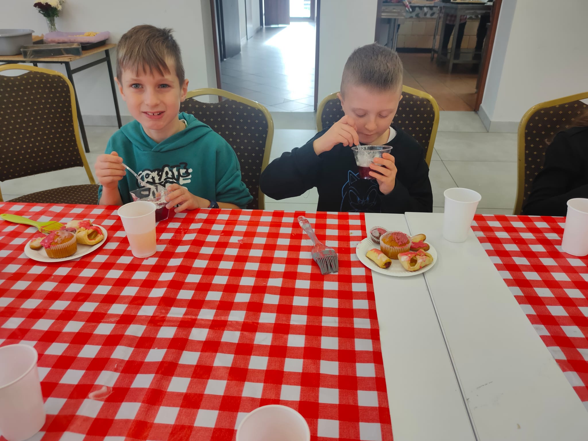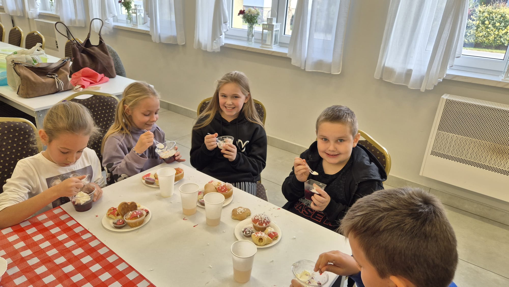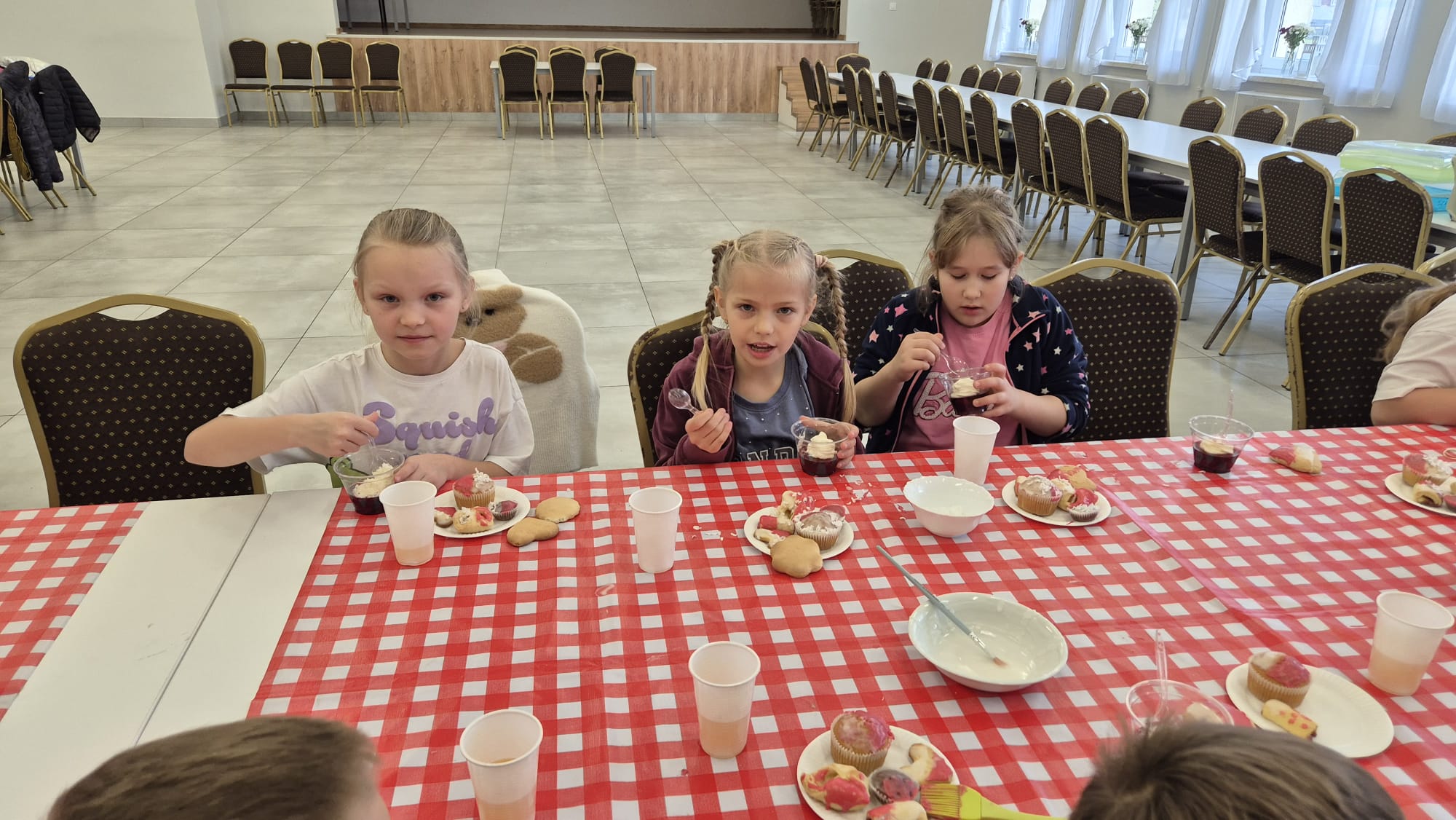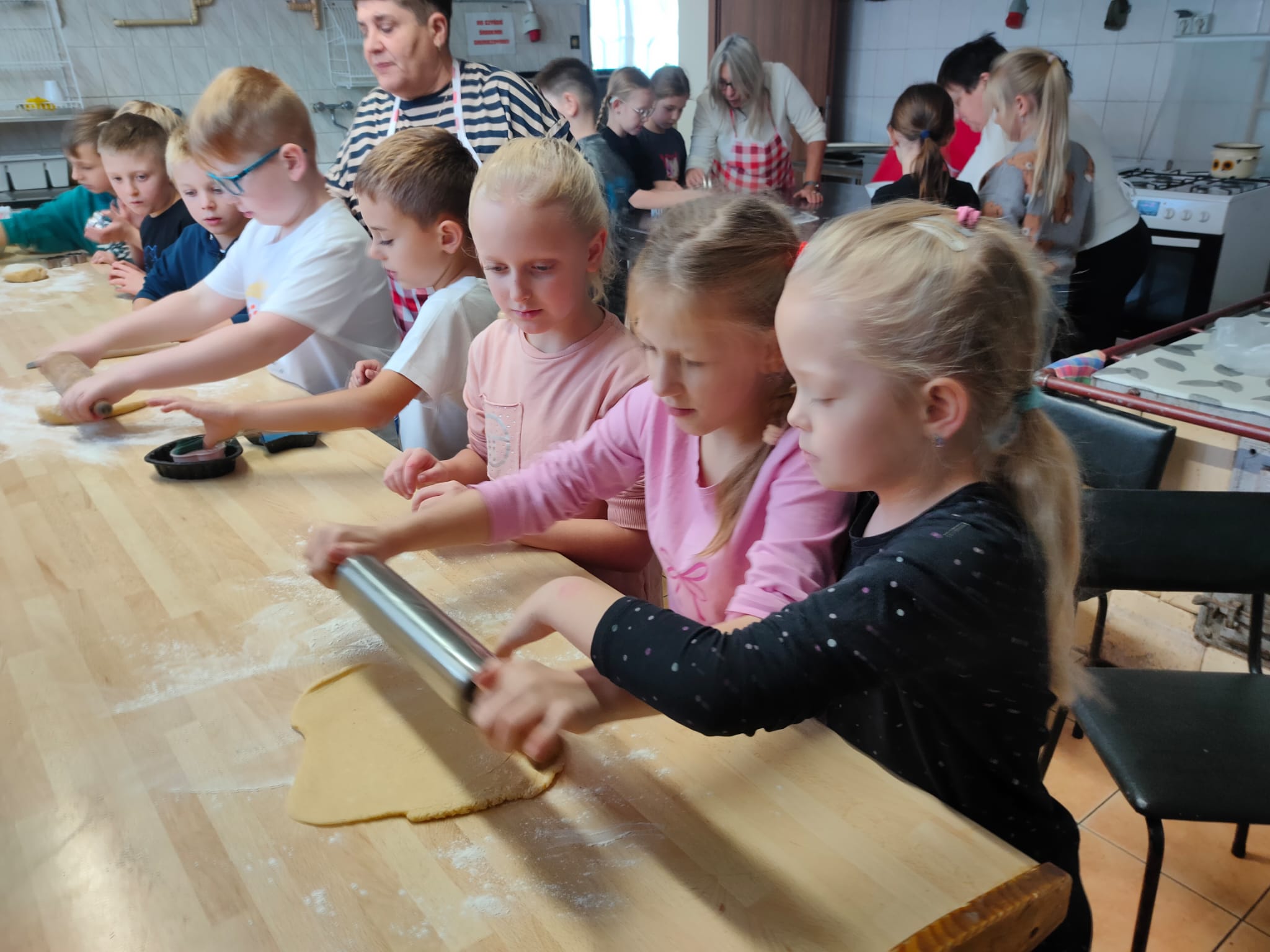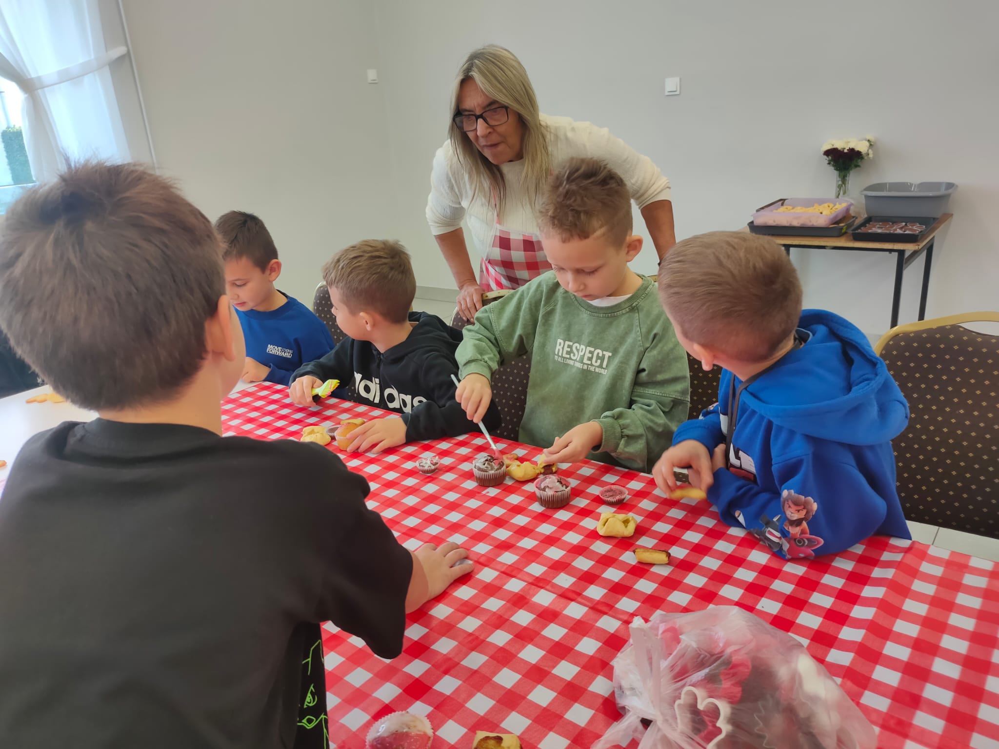 Po zakończeniu pracy na wszystkich czekała miła niespodzianka – panie z Koła Gospodyń Wiejskich poczęstowały dzieci smacznym deserem, babeczkami i sokiem. Spotkanie przebiegło w miłej i radosnej atmosferze, a uczniowie z dumą zabrali do domu własnoręcznie upieczone ciasteczka.