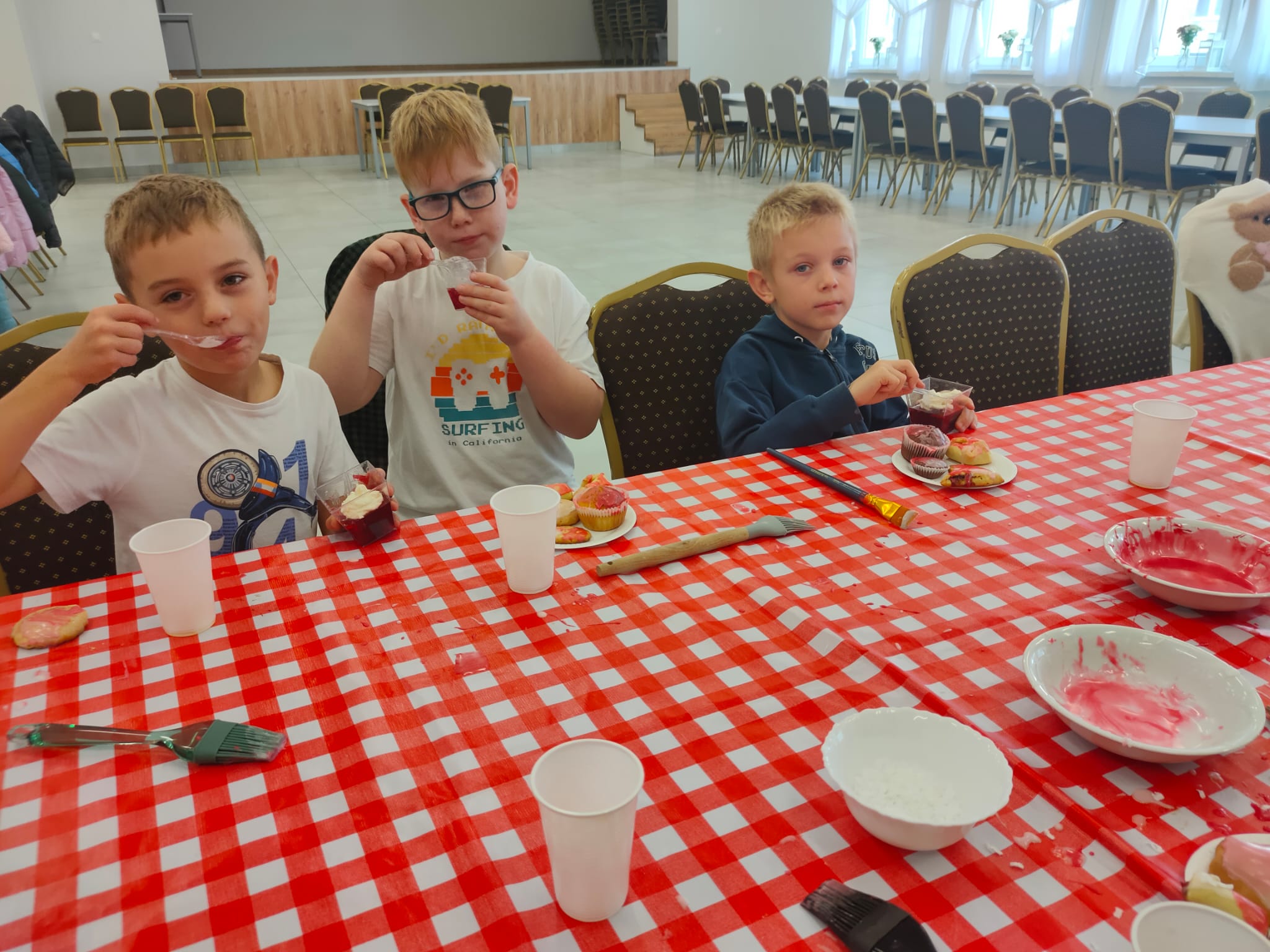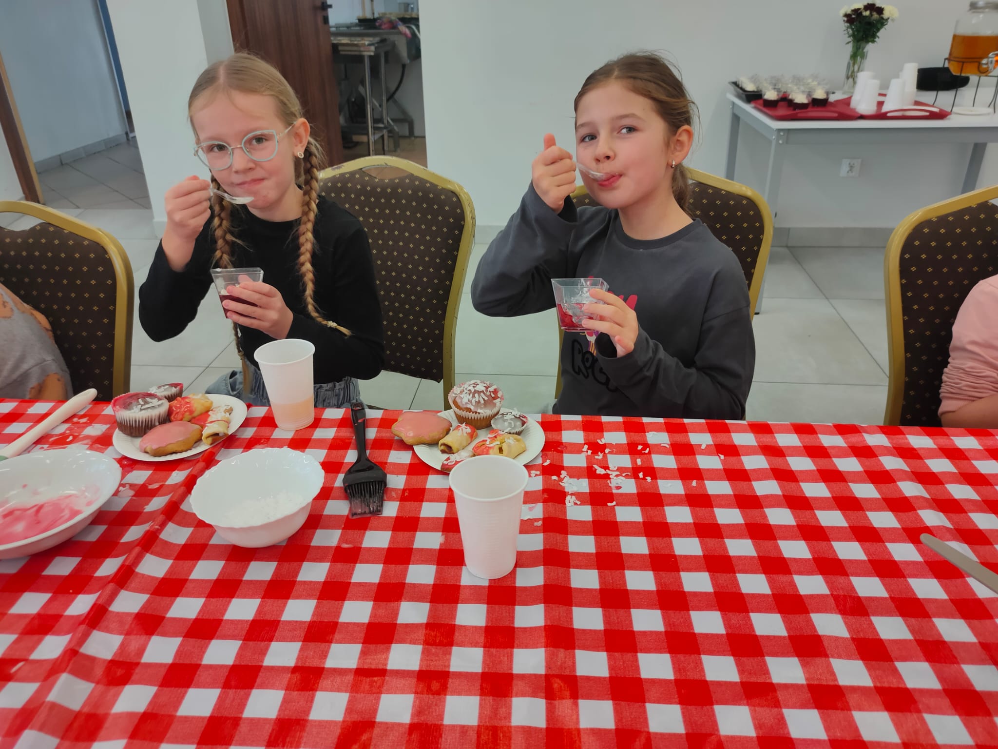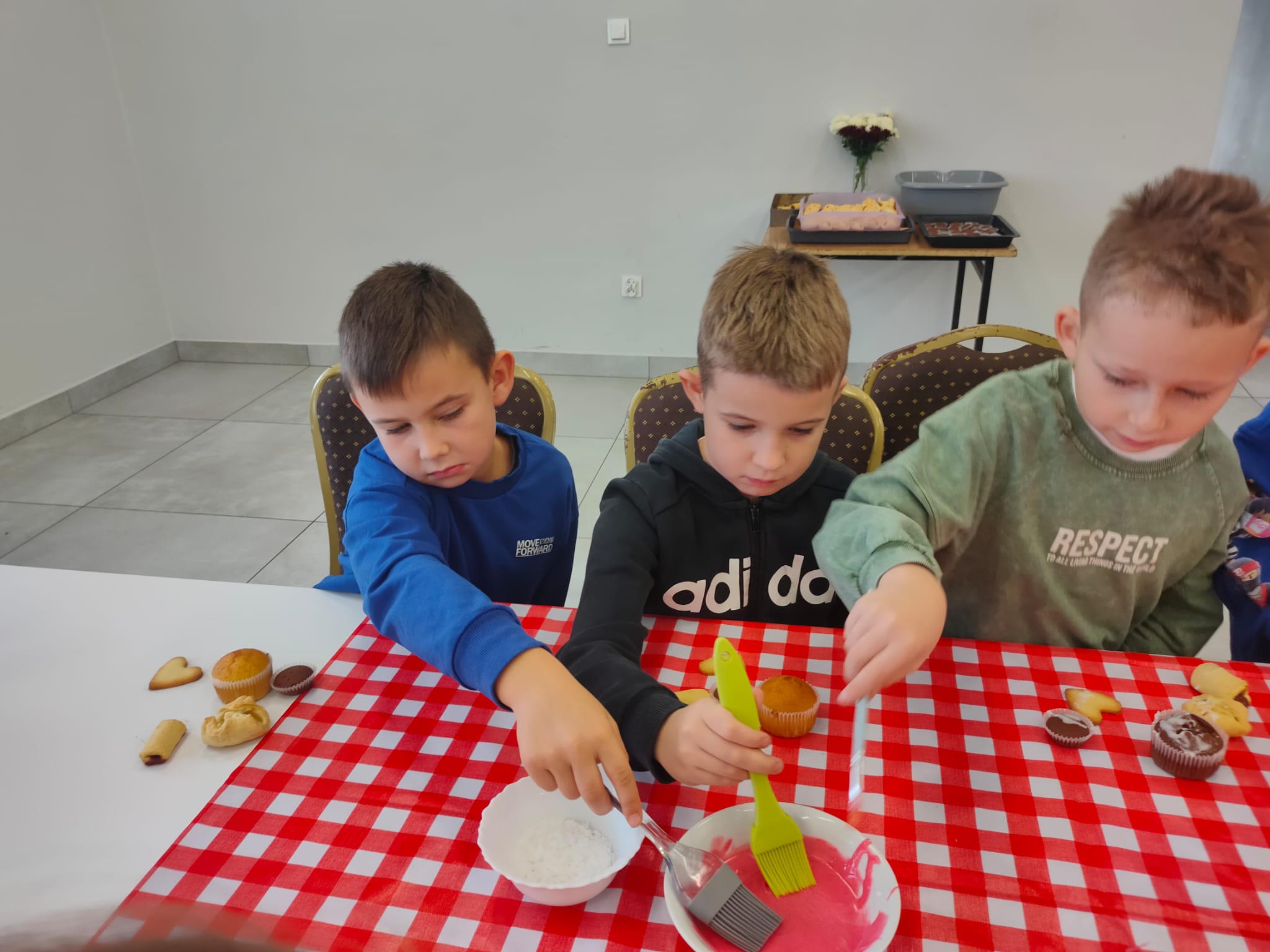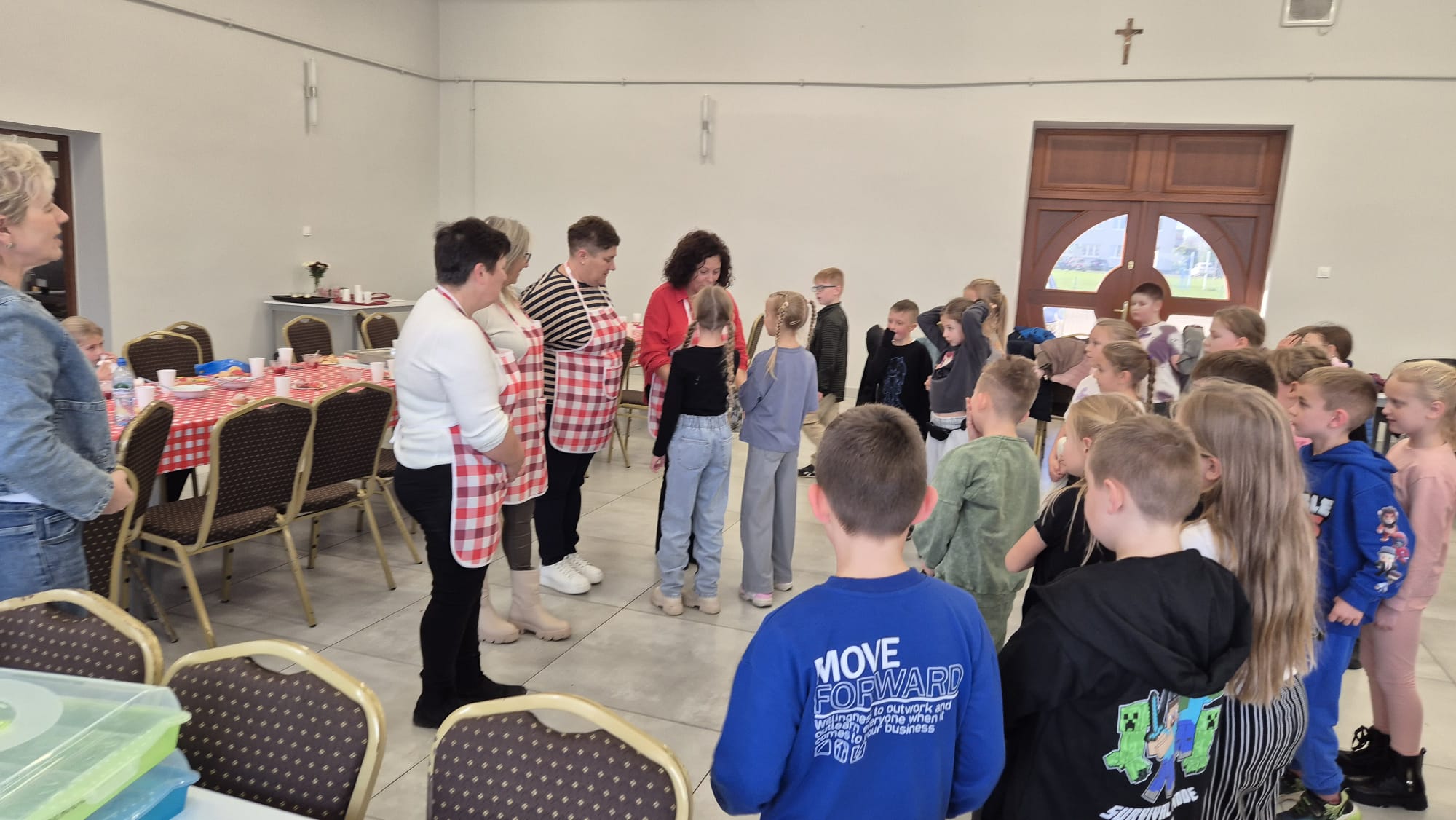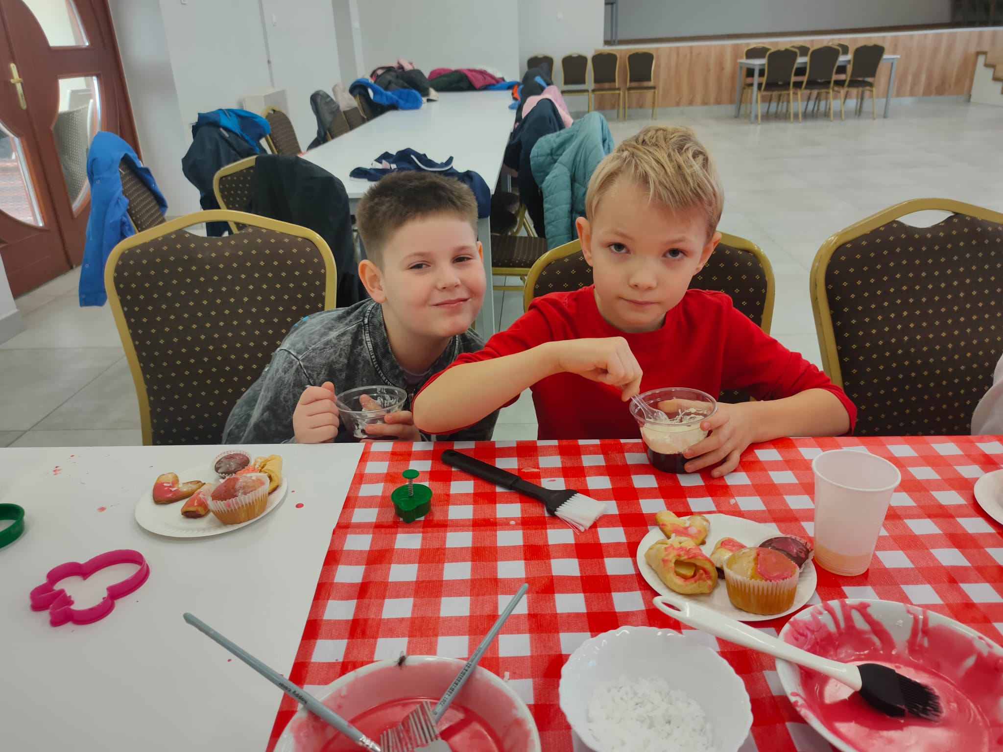 Po zakończeniu pracy na wszystkich czekała miła niespodzianka – panie z Koła Gospodyń Wiejskich poczęstowały dzieci smacznym deserem, babeczkami i sokiem. Spotkanie przebiegło w miłej i radosnej atmosferze, a uczniowie z dumą zabrali do domu własnoręcznie upieczone ciasteczka.