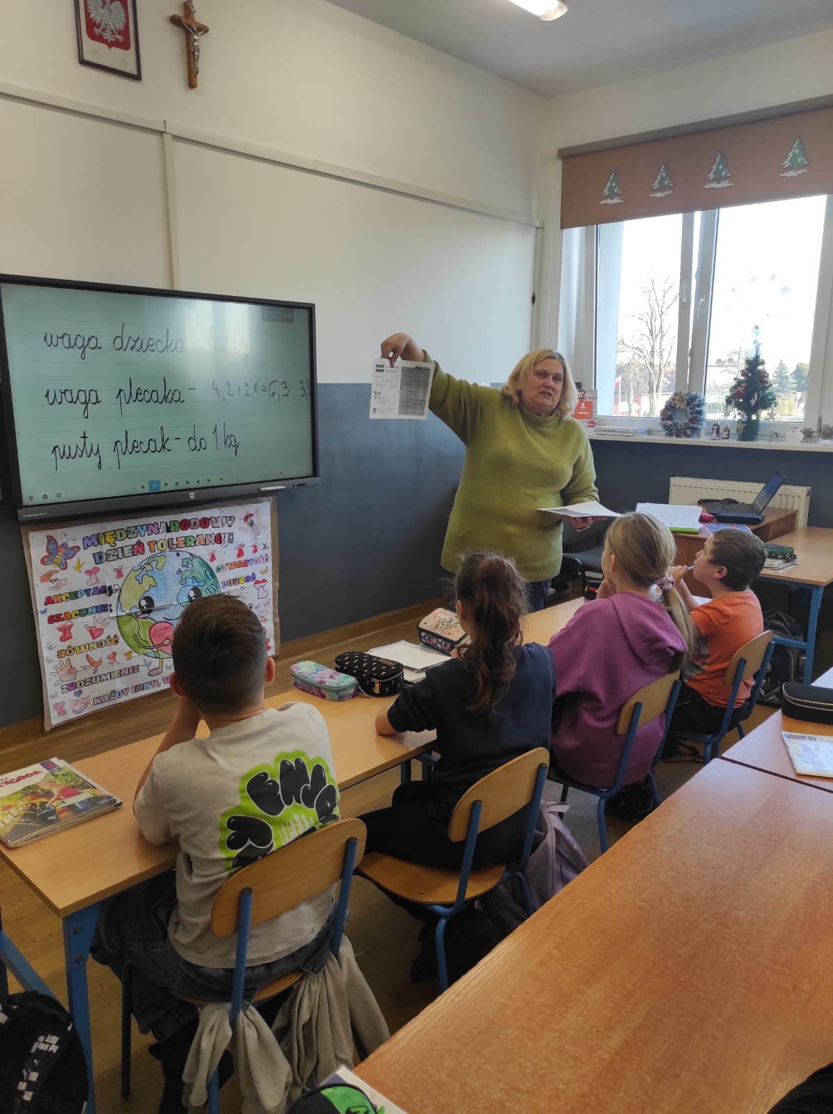W środę 12 grudnia klasa 3 uczestniczyła w spotkaniu z panią higienistką szkolną, poświęconym tematyce wad postawy. Uczniowie dowiedzieli się, że na postawę ciała wpływają między innymi sposób siedzenia w ławce, ilość ruchu w ciągu dnia oraz waga i sposób noszenia plecaka. Pani Ewa uświadomiła dzieciom, że waga ich plecaka nie powinna przekraczać 15% wagi ich ciała. Pokazała jak prawidłowo pakować i nosić tornister. Zachęcała do codziennej aktywności fizycznej. Uczniowie klasy trzeciej z dużym zainteresowaniem uczestniczyli w zajęciach, ważyli swoje plecaki, zadawali pytania. Dziękujemy pani Ewie za ciekawe spotkanie.