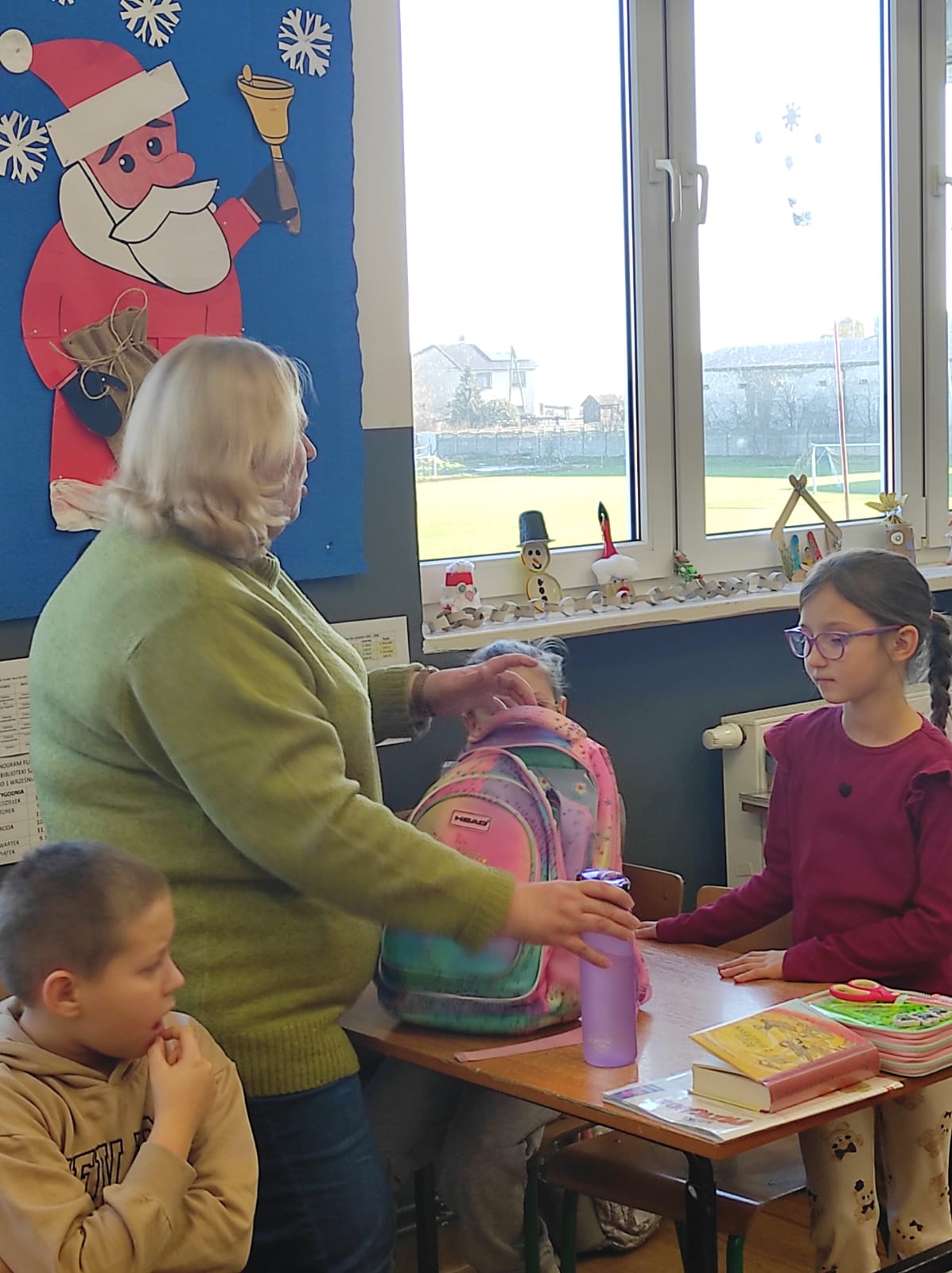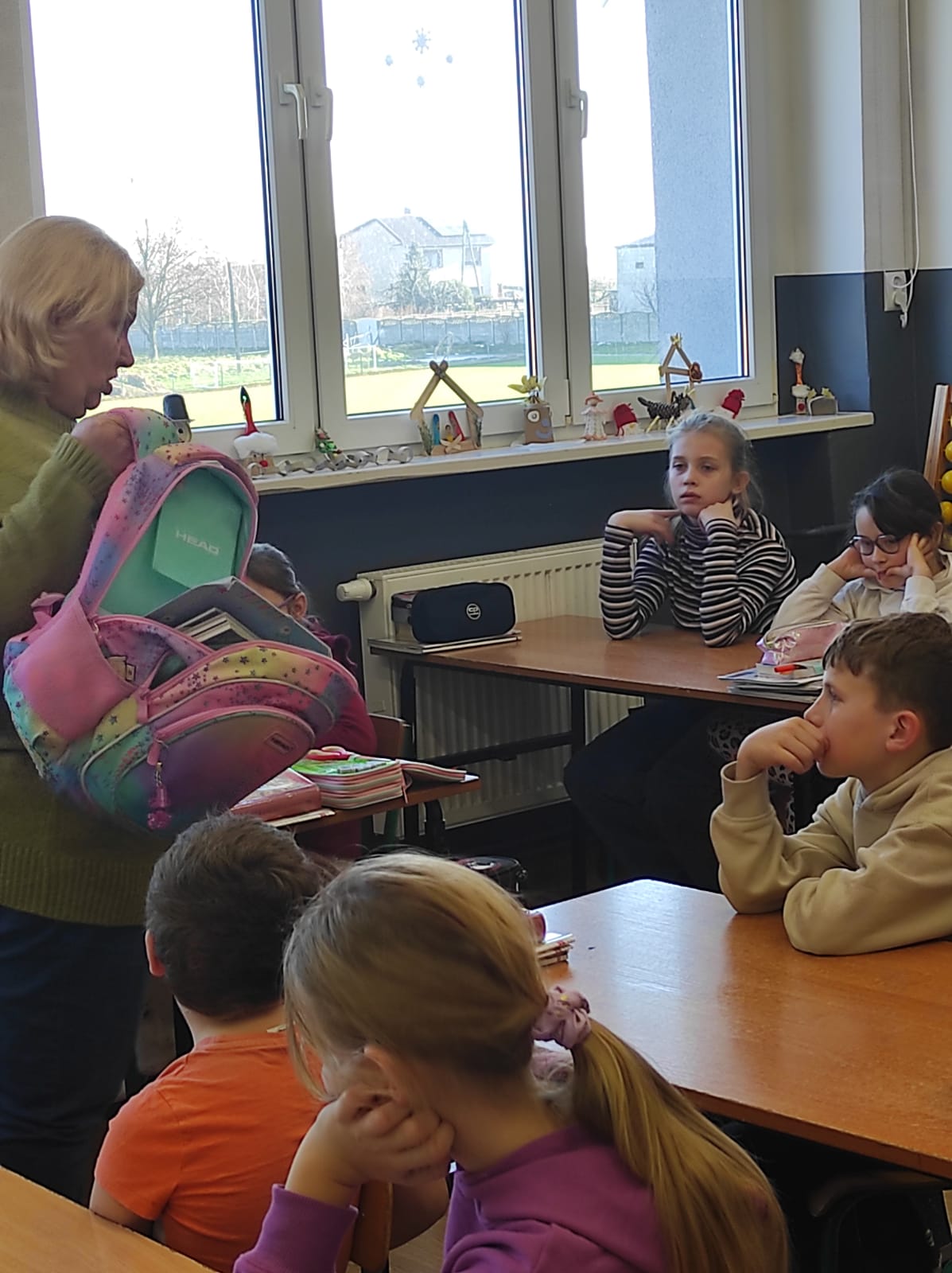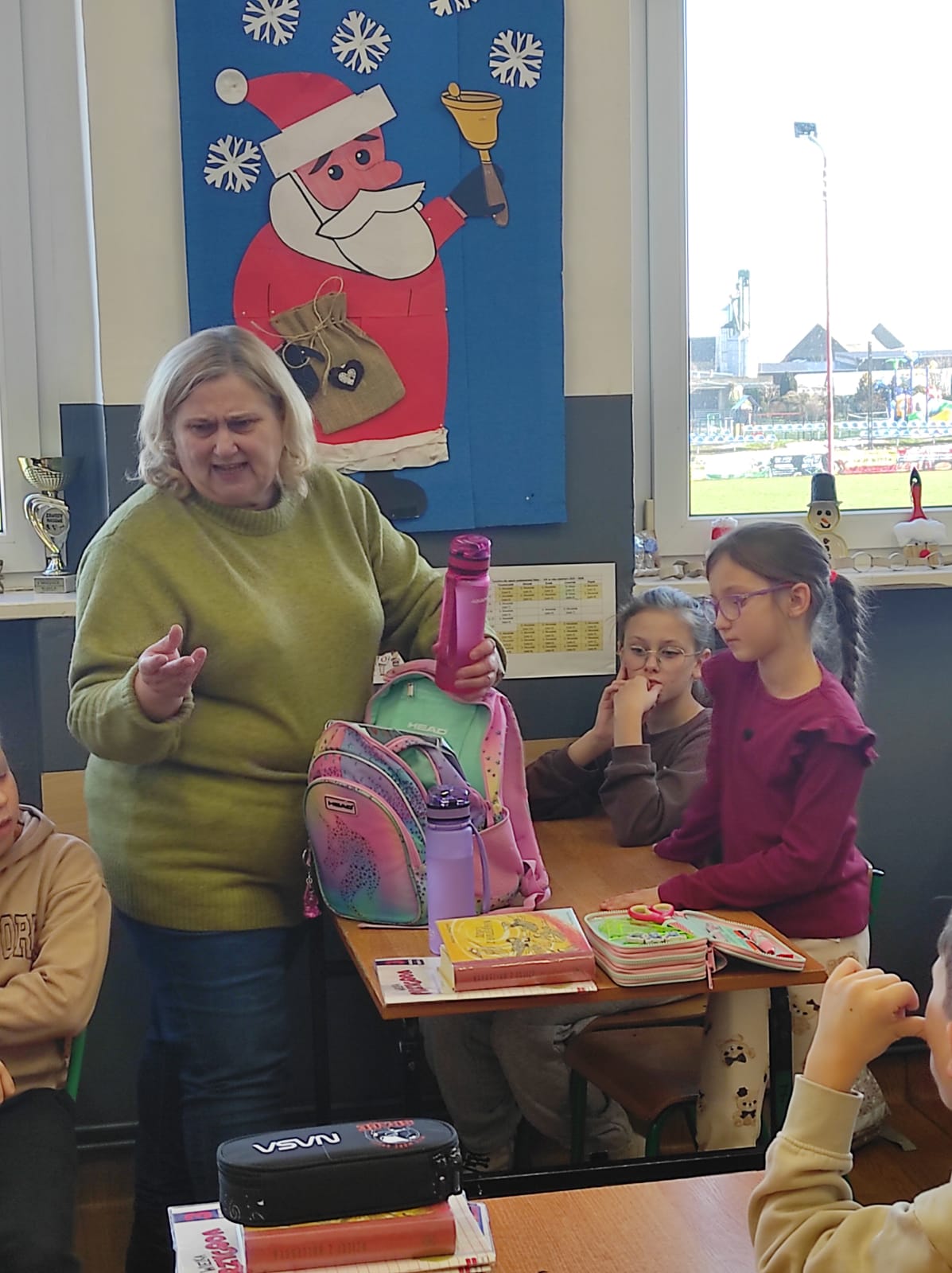 W środę 12 grudnia klasa 3 uczestniczyła w spotkaniu z panią higienistką szkolną, poświęconym tematyce wad postawy. Uczniowie dowiedzieli się, że na postawę ciała wpływają między innymi sposób siedzenia w ławce, ilość ruchu w ciągu dnia oraz waga i sposób noszenia plecaka. Pani Ewa uświadomiła dzieciom, że waga ich plecaka nie powinna przekraczać 15% wagi ich ciała. Pokazała jak prawidłowo pakować i nosić tornister. Zachęcała do codziennej aktywności fizycznej. Uczniowie klasy trzeciej z dużym zainteresowaniem uczestniczyli w zajęciach, ważyli swoje plecaki, zadawali pytania. Dziękujemy pani Ewie za ciekawe spotkanie.