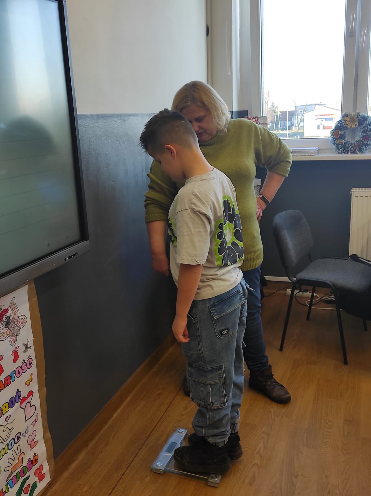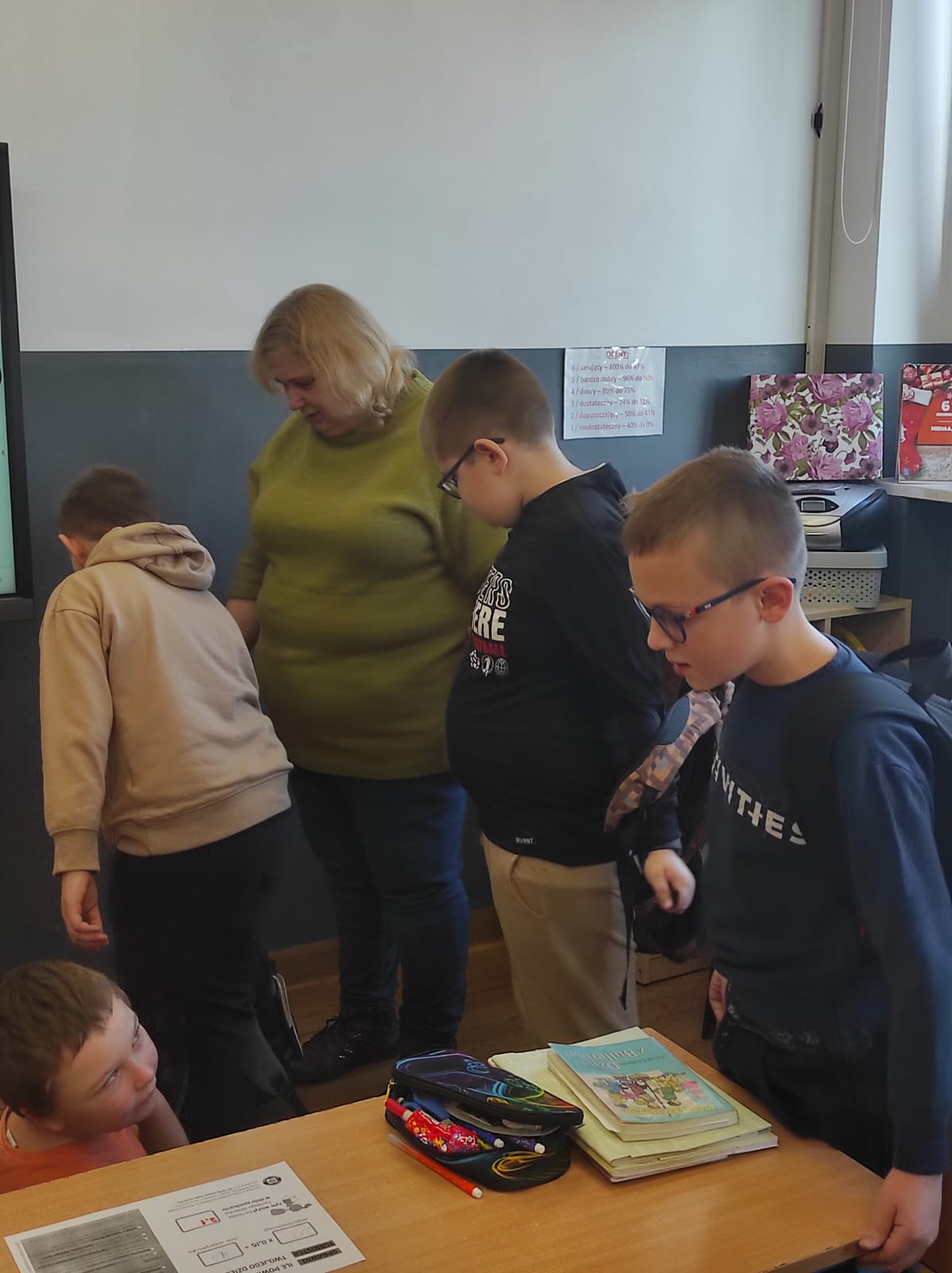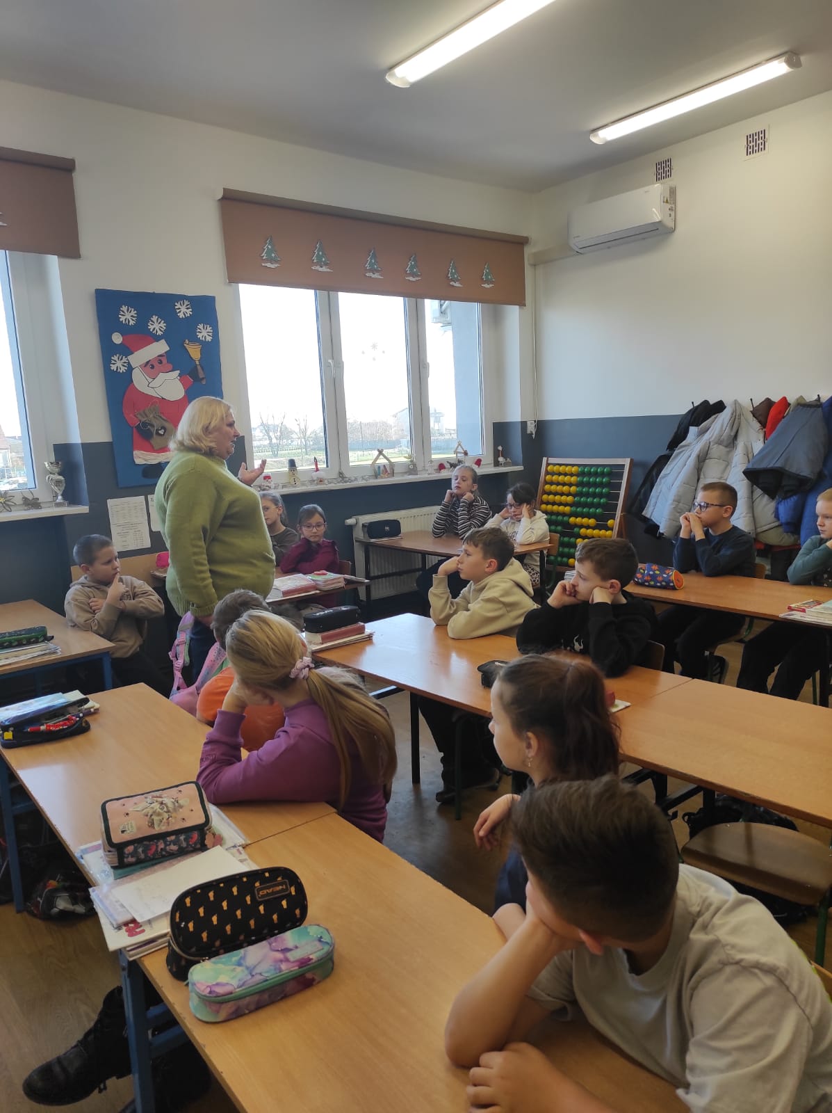 W środę 12 grudnia klasa 3 uczestniczyła w spotkaniu z panią higienistką szkolną, poświęconym tematyce wad postawy. Uczniowie dowiedzieli się, że na postawę ciała wpływają między innymi sposób siedzenia w ławce, ilość ruchu w ciągu dnia oraz waga i sposób noszenia plecaka. Pani Ewa uświadomiła dzieciom, że waga ich plecaka nie powinna przekraczać 15% wagi ich ciała. Pokazała jak prawidłowo pakować i nosić tornister. Zachęcała do codziennej aktywności fizycznej. Uczniowie klasy trzeciej z dużym zainteresowaniem uczestniczyli w zajęciach, ważyli swoje plecaki, zadawali pytania. Dziękujemy pani Ewie za ciekawe spotkanie.
